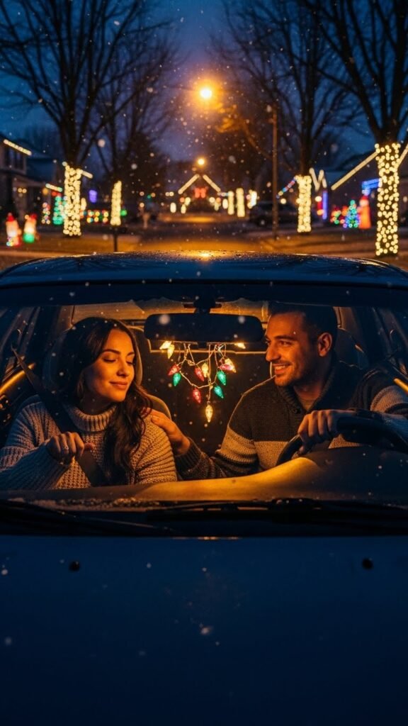Drive around late at night to see holiday lights, talk softly, play your playlist, or hold hands. The darkness and lights create a dreamy atmosphere that feels peaceful and romantic. It becomes a yearly ritual because it feels like you’re escaping into your own private world.