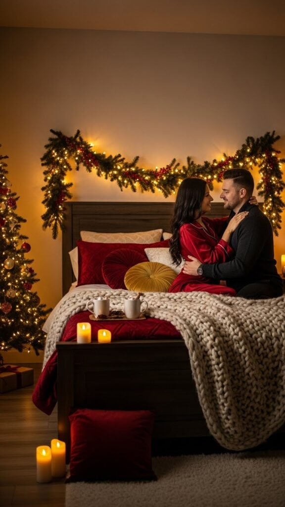 Transform your bedroom into a holiday-themed love nest — soft lights, candles, winter-scented bedding, cozy blankets, and warm textures everywhere. When your bedroom feels like a magical sanctuary, it becomes easier to relax, bond, and connect physically and emotionally. You can add garlands, wreaths, Christmas pillows, or soft glowing lamps to create ambience. The act of decorating together also strengthens teamwork and builds closeness. This becomes a tradition because once you experience how romantic a holiday bedroom feels, you’ll want to recreate that magic every year. After decorating, spend time cuddling, whispering, or enjoying a quiet night together. The room becomes your escape from everything else — a place where the stress melts away and the romance deepens.