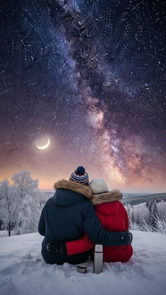 A winter walk under the stars is one of the simplest yet most romantic holiday experiences a couple can share. It combines silence, softness, and closeness in a way few other moments can. The world feels quieter in winter—houses glowing with warm lights, crisp air filling your lungs, and the moon shining brightly against the cold sky. When you take your partner’s hand and step outside together, it feels like you’re entering your own private world, away from noise, stress, and responsibilities. The stillness of the night naturally brings you closer, making every breath shared a little more intimate.