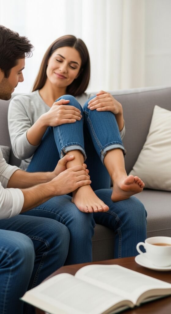 If she is comfortable, move to her legs and feet. Women love when their husbands take time to massage their feet because it makes them feel nurtured and adored. Slow pressure on the arches, gentle strokes along her calves, and warm hands wrapping around her ankles can send waves of relaxation through her whole body. This part feels deeply intimate and emotional — it makes her feel safe, feminine, and loved.