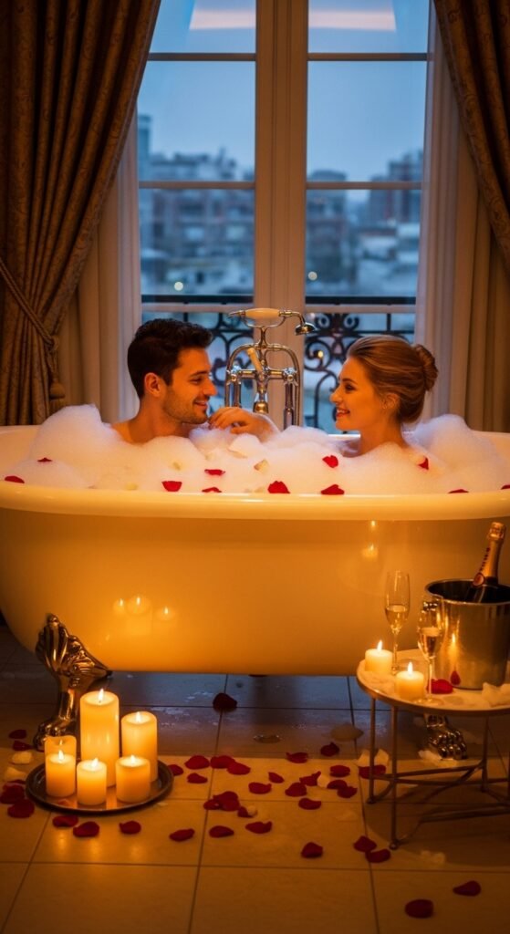 A classic for a reason. Fill your tub with bubbles, candles, and maybe a few rose petals. Play soft music, bring champagne, and take turns washing each other’s backs. It’s calming, sensual, and perfect for unwinding together.