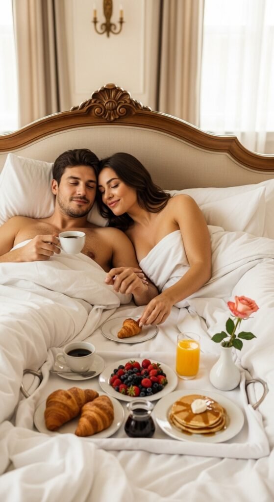 Start the morning with pancakes, fruit, or coffee — all enjoyed in bed, skin to skin. The mix of cozy comfort and intimate connection sets a loving tone for the day. No rush, just quiet time together.