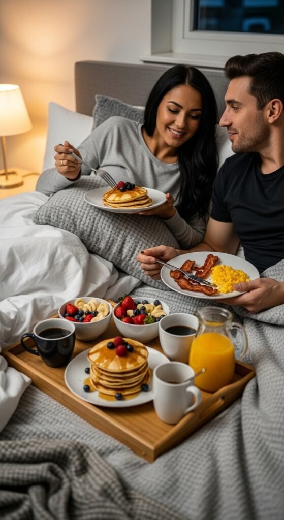 Turn your bedroom into a cozy dining spot by making a playful “breakfast-for-dinner” date. Think pancakes, waffles, or omelets served on a tray with juice or champagne. Add candles or fairy lights for a romantic glow. Sharing food in bed feels intimate and relaxed, making the night both fun and comforting. It’s simple but feels special because you’re breaking the rules of where meals “should” happen.