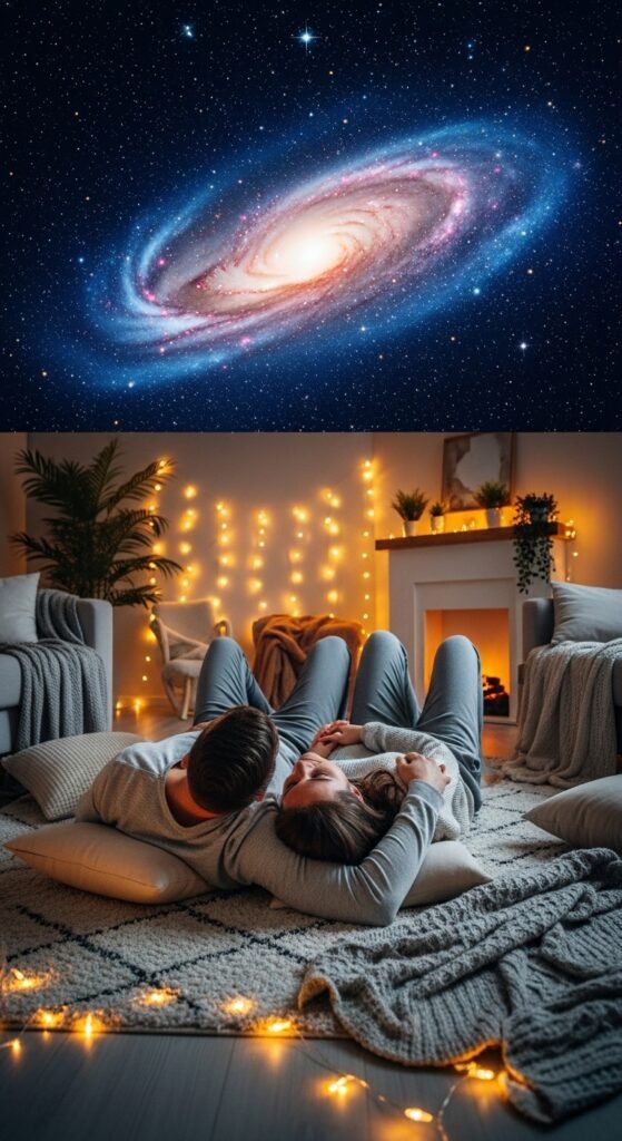 Turn off the lights, set up a star projector, or stick glow-in-the-dark stars on the ceiling. Play soft music and snuggle under the covers while “stargazing.” Add warm drinks like tea or cocoa for comfort. It creates a dreamy, magical vibe without stepping outside. This sweet and whimsical date idea will leave you both feeling closer and more relaxed.